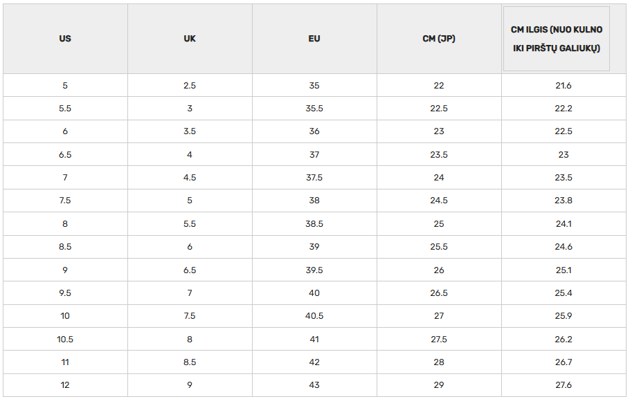 KEEN batai atitinka standartinius europinius dydžius, todėl tinkamą porą išsirinkti paprasta. Rekomenduojame vadovautis dydžių lentele, pateikta šalia pasirinkto modelio – joje nurodytas pėdos ilgis centimetrais, tad lengvai rasite tikslų dydį ir užtikrinsite maksimalų komfortą.